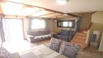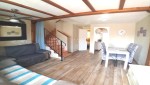 El salón-comedor tiene techo con vigas y una pared de piedra. La cocina independiente está totalmente equipada con electrodomésticos y tiene una puerta trasera que da a un patio.