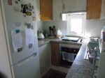 La cocina equipada consta de unidades de pared y piso, cocina de gas con extractor arriba y horno eléctrico debajo, nevera-congelador y hay espacio para mesa y sillas en la entrada de la cocina.