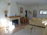 La puerta se abre en un amplio salón / comedor con chimenea y dos ventiladores de techo.  Un arco conduce a través de una moderna cocina equipada con espacio de almacenaje grande, vitrocerámica y horno eléctrico.  La cocina es de baldosas de piso a techo e incorpora un armario de la despensa incorporada.