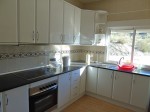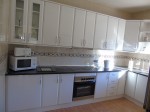 The front door opens into a spacious lounge / dining room with feature fireplace and two ceiling fans.  An archway leads through to a modern fitted kitchen with great storage space, a ceramic hob and electric oven.  The kitchen is tiled from floor to ceiling and incorporates a built-in pantry cupboard.
