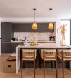 La cuisine dispose d'un îlot central avec d'élégants comptoirs en marbre, d'appareils électroménagers haut de gamme en acier inoxydable et de luminaires sophistiqués. Cet espace est conçu pour créer une atmosphère accueillante, parfaite pour cuisiner et se divertir.